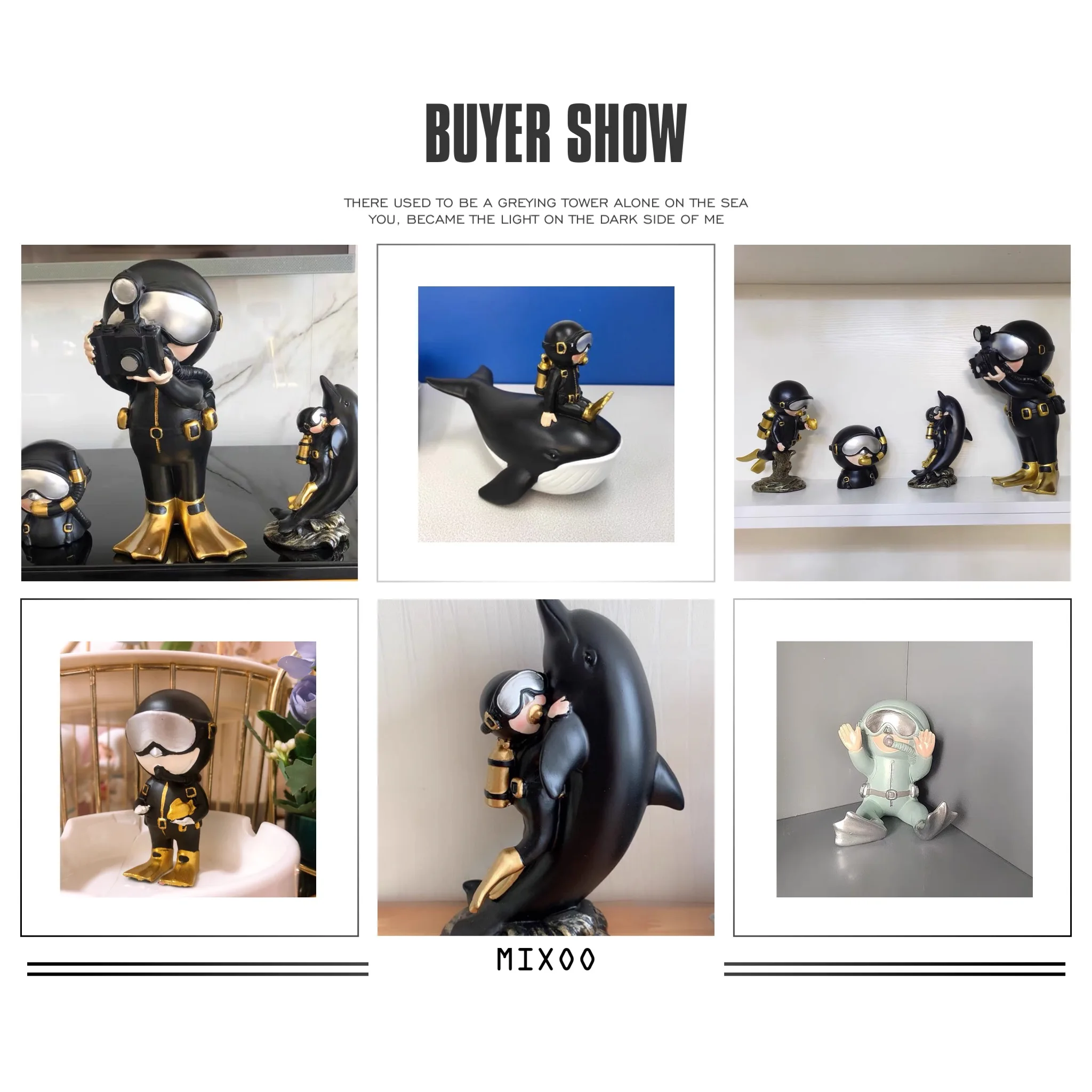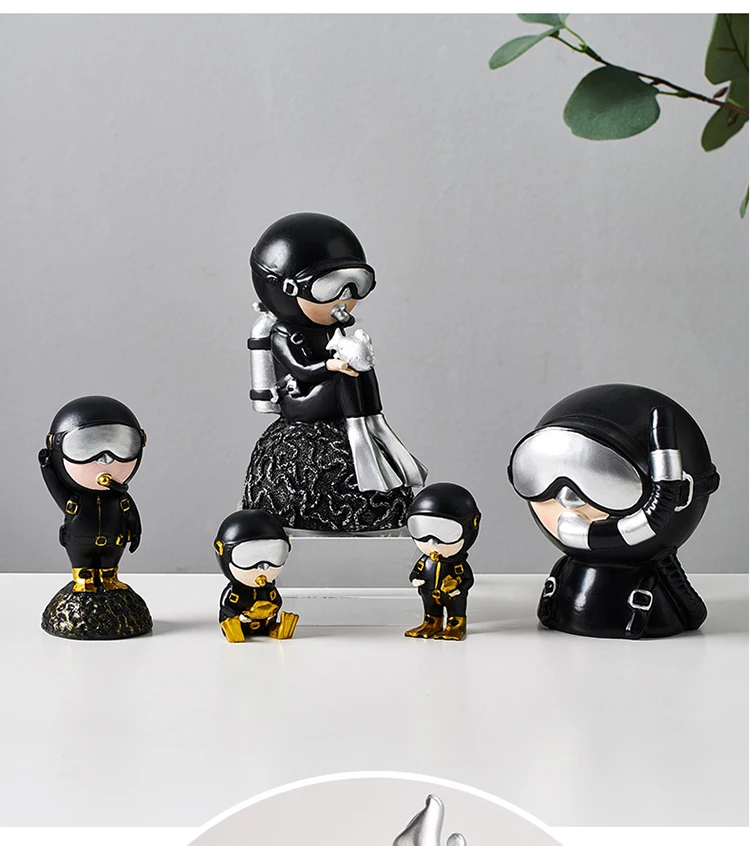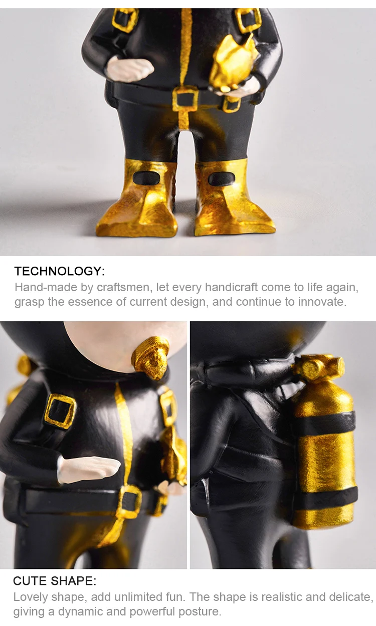 The miniature scuba diver in a black suit with shiny gold accents is a great addition to your home. Various creatures of the sea have also been included in the collection to add to the attractiveness of the piece. These resin figurines are strong and temperature resistant making them perfect for both indoor and outdoor decor.